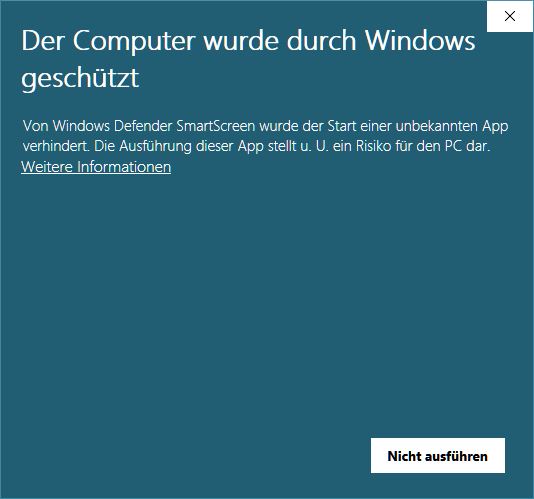 | Die Installationsdatei und auch die Programmdatei selbst ist für Windows neu. Daher erscheint ggf. folgende Warnmeldung: |