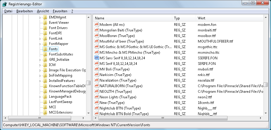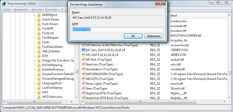 Font-Liste der Systemsteuerung! Um den Darstellungsfehler zu korrigieren muss man also die korrekte Zuordnung wieder herstellen, was über den Registrierungseditor von Windows möglich ist. Dazu klicken Sie links unten auf das Windows-Symbol und dann auf "Ausführen", dann geben Sie regedit ein und betätigen die <enter>-Taste. Es öffnet sich, nach einer Sicherheitsmeldung, der Registrierungseditor: Achtung: Die Manipulation von Daten in der Registrierungsdatei von Windows muss sehr bewusst erfolgen, weil falsche Einträge zu schwerwiegenden Problemen am Betriebssystem führen können. Ggf. lassen Sie die Korrektur also von einem erfahrenen Administrator ausführen! ![]() Hier hangeln Sie sich links nacheinander durch folgende Ordner: HKEY_LOCAL_MACHINE SOFTWARE MICROSOFT ![]() WINDOWS NT CurrentVersion ![]() Fonts Hier nun suchen Sie rechts den Eintrag "MS Sans Serif 8,10,12,14,18,24" - mit der rechts davon zugeordneten Datei. ![]() Per Doppelklick auf den Eintrag rechts können Sie die Font-Datei editieren und den Dateinamen sseriff.fon durch sserife.fon ersetzen. ![]() Spätestens nach einem Windows-Neustart wird "HS Nettoeinkommen Pro" dann normal und wie erwartet aussehen: ![]() |