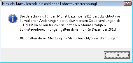 Der Gesetzgeber hat im Laufe des Jahres 2015 beschlossen, diverse Steuersenkungsmaßnahmen rückwirkend (!) zum 1.1.2015 in Kraft zu setzen. Vor dem Hintergrund der Änderungen durch das Gesetz zur Anhebung des Grundfreibetrags, des Kinderfreibetrags, des Kindergeldes und des Kinderzuschlags vom 16. Juli 2015 (BGBl. I Seite 1202) wurden im Einvernehmen mit den obersten Finanzbehörden der Länder die Programmablaufpläne separat für den Lohnsteuerabzug für Dezember 2015 bekannt gemacht. Um nämlich ein Aufrollen der bereits durchgeführten Lohnabrechnungen des Jahres 2015 zu vermeiden, werden nun die tariflichen Änderungen (Erhöhung des Grundfreibetrags, des Kinderfreibetrags und des Entlastungsbetrags) zusammengefasst im Dezember 2015 berücksichtigt. Dies ermöglicht die Programmversion 23.10, die letzte Programmversion für das Jahr 2015. Ein kostenloses Update für Ihre 2015er Vollversion finden Sie hier.Ein entsprechender Hinweis, der auf die Besonderheit der Dezember-Berechnung im Jahr 2015 hinweist, erscheint bei jedem Programmstart bzw. jeder Wahl des Berechnungsmonats Dez-2015. Dieser Hinweis kann jedoch über das Menü Ansicht/ohne Warnungen abgeschaltet werden! Selbstverständlich enthält auch das neue Programm der Versionsreihe 24.xx für das Jahr 2016 ebenso diese Berechnung für den Dezember 2015! ![]() ACHTUNG: